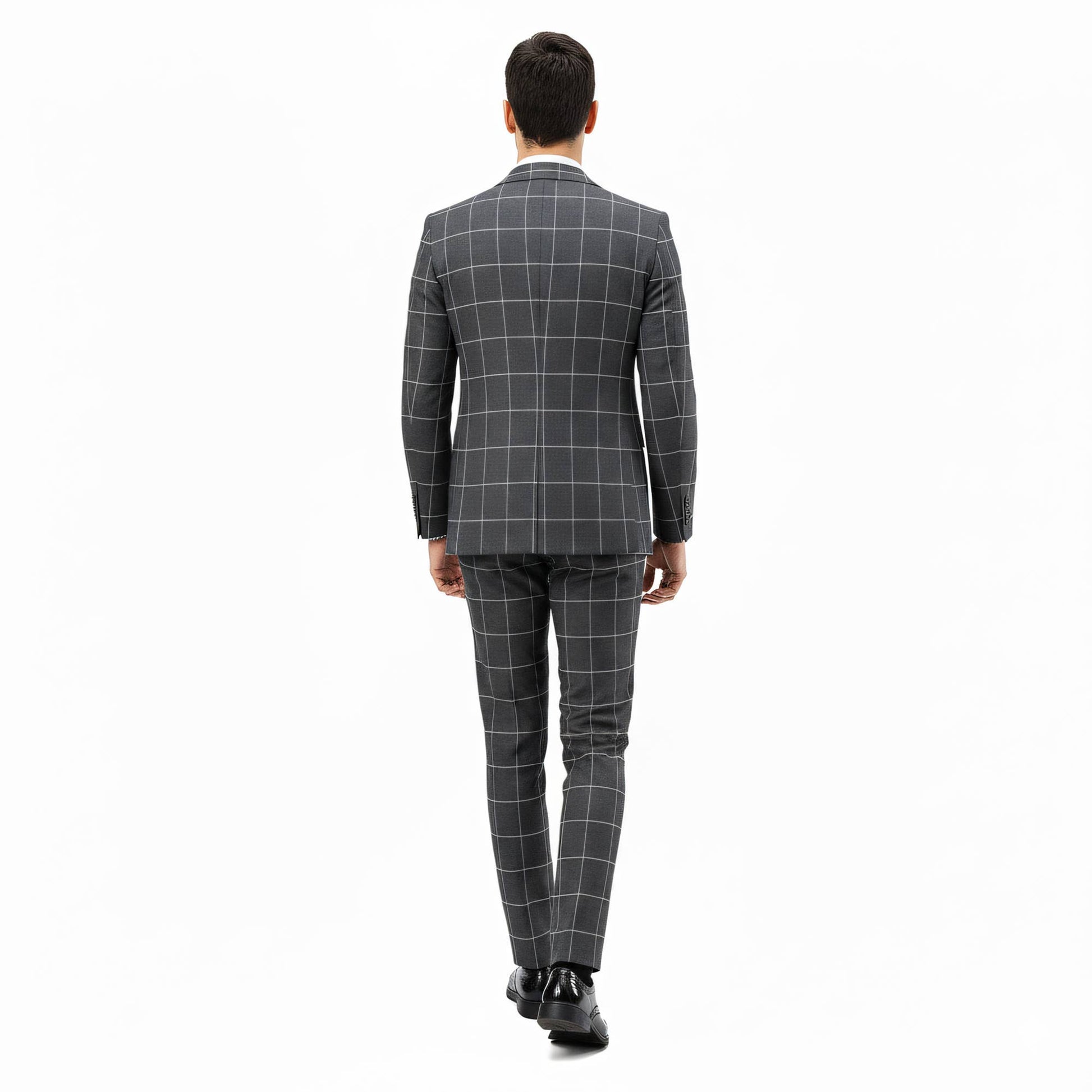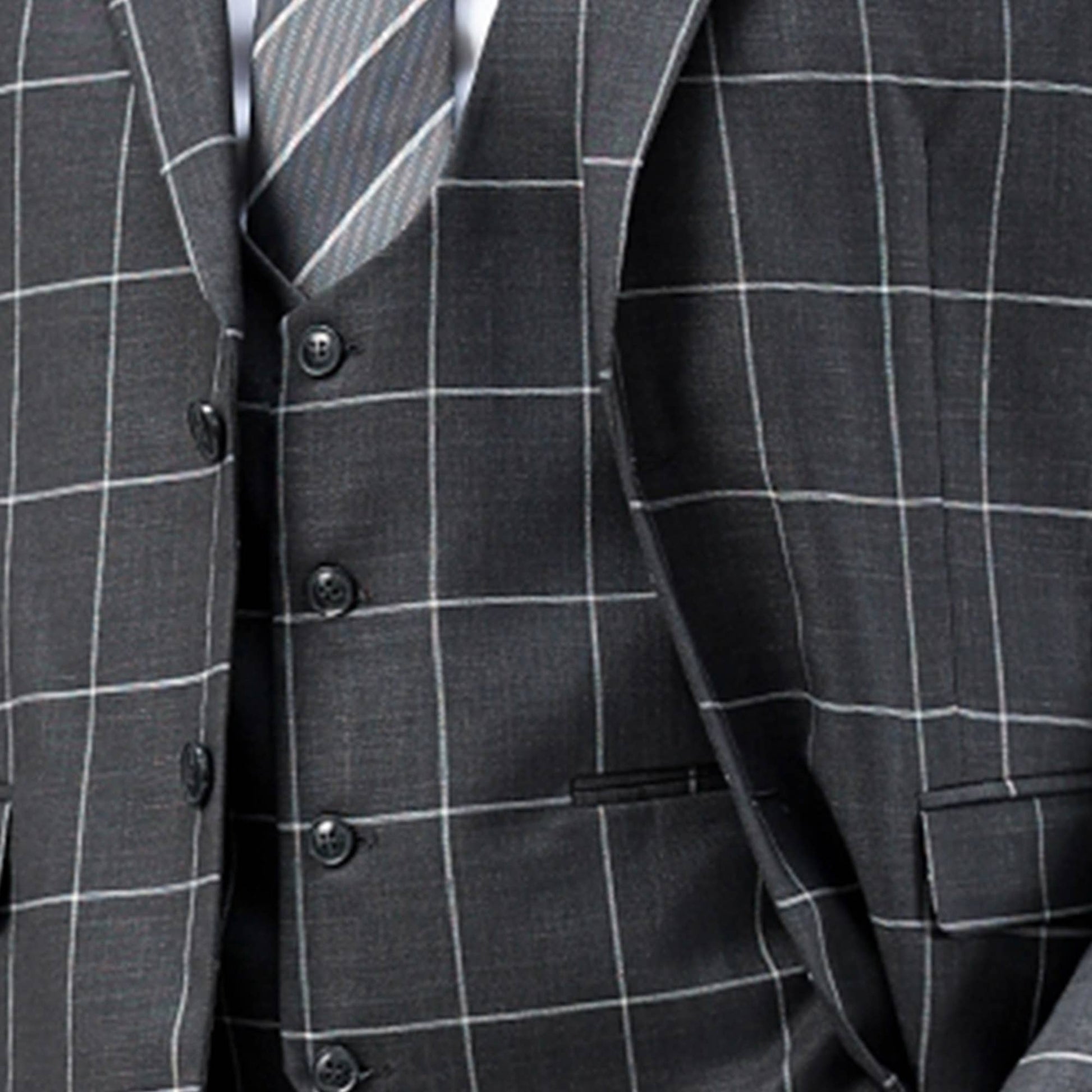 Elevate your formal wardrobe with this Sean Alexander 3-Piece Windowpane Suit Set, tailored in Hybrid Fit H2 for a modern, tapered silhouette. The jacket showcases a refined windowpane pattern, two button front closure, notch lapel, besom chest pocket, flap front pockets, three interior pockets, and underarm sweat guards for confident all day wear. The matching vest features a U-neck finish, four button front, two besom pockets, and an adjustable back strap for a secure fit. Completing the set, the flat front pants include belt loops, angled slip pockets, back besom pockets with button closure, zip fly with extended button waistband, and lining to the knee for added comfort. Designed to deliver a sharp and polished appearance, this suit is ideal for weddings, professional events, and special occasions. Includes a 6-inch drop. Example: Jacket 46R comes with 40W pants.